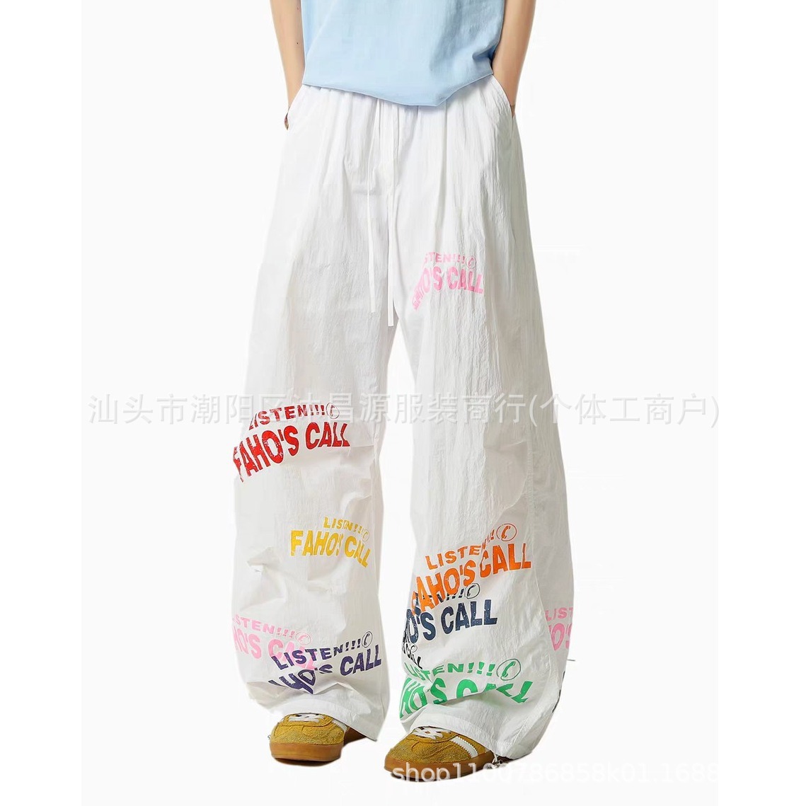 夏薄いアメリカンシンプルなカラフルなレタープリント巾着ワイドレッグパンツルーズカジュアルパラシュートパンツスリムパンツ