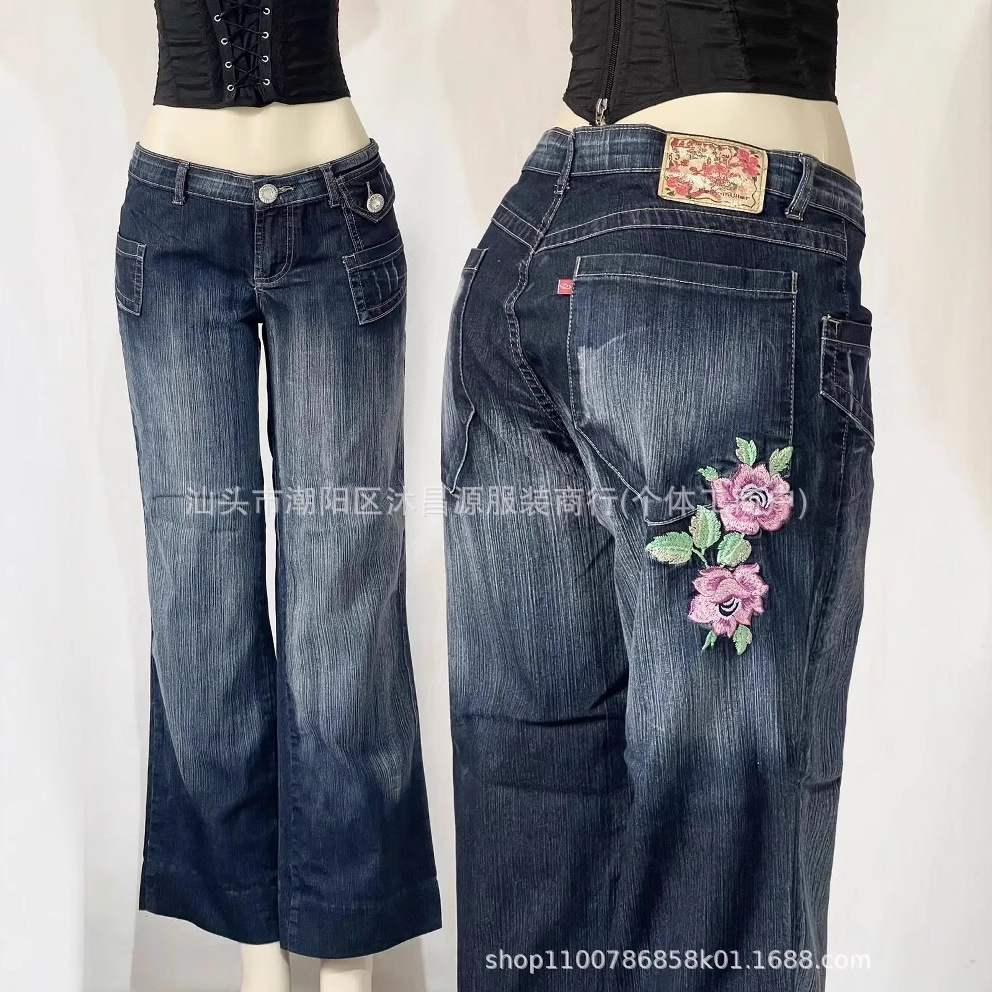 国境を越えた外国貿易アメリカンレトロな春と秋の新しいジーンズ男性と女性の花刺繍ルーズスリムストレートパンツ