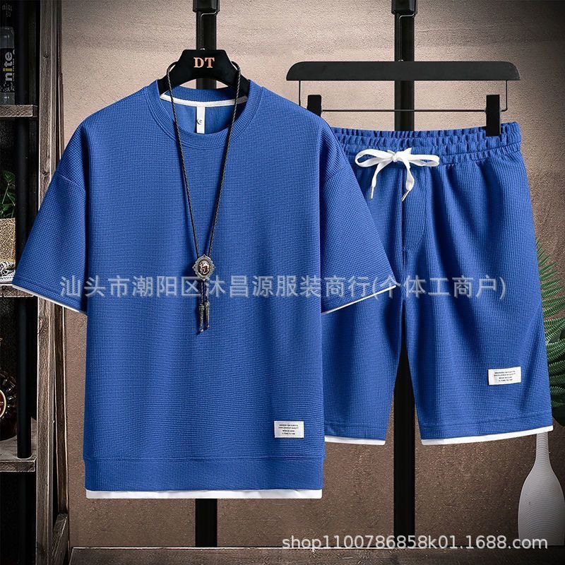 国境を越えた対外貿易ワッフルtシャツ半袖春夏の新型男女ゆるい氷糸レジャー運動上着パンツ