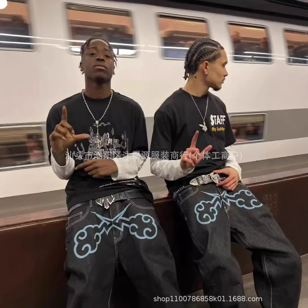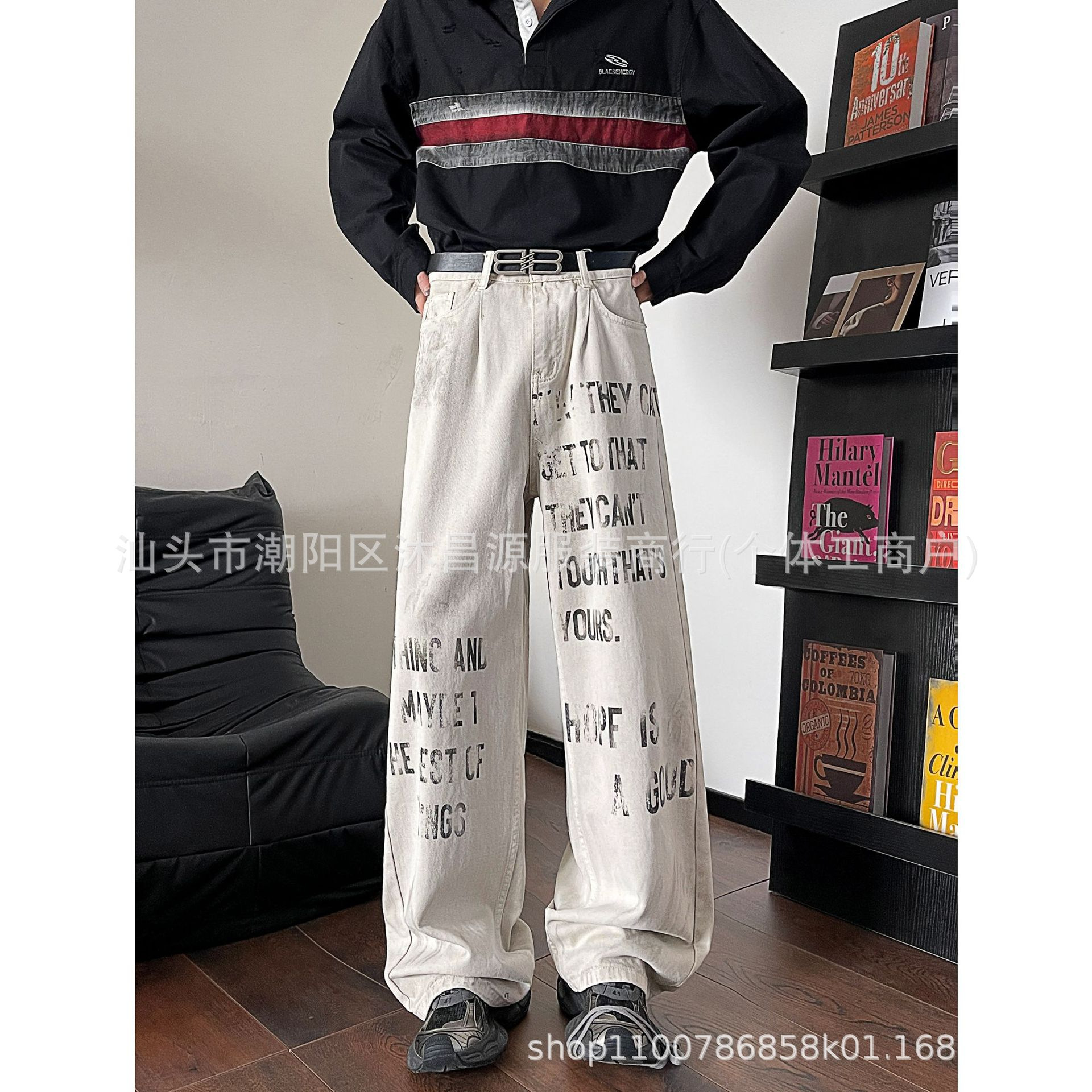 原宿プリントジーンズ男性式アメリカ風水洗いパターンカジュアルジーンズ新型Y2K街着パターンパンツ