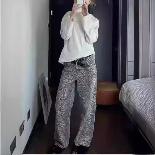 2024新型アメリカ式高街レトロ豹柄ジーンズ男女直筒ゆるい欧米カジュアルモップ男