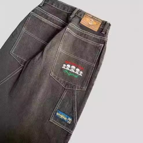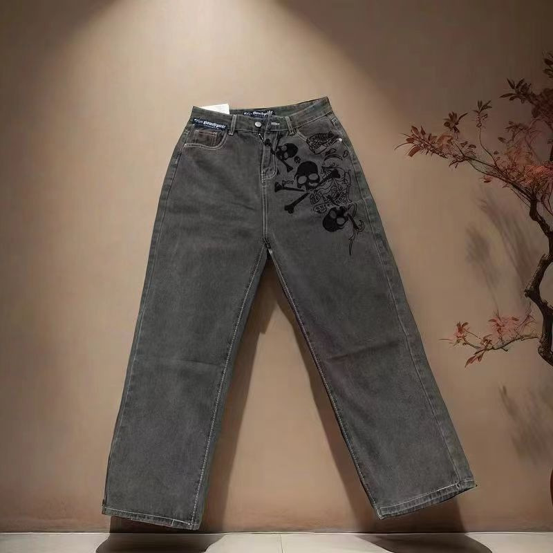 2024新型アメリカ式高街y 2kレトロ黒灰色頭蓋プリントゆるいストレートジーンズ男