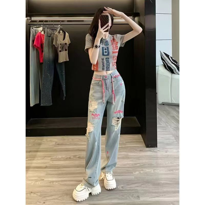 国境を越えた電気商のゆるいジーンズヒップホップロックのプリント街のレトロな原宿高腰の広いジーンズ