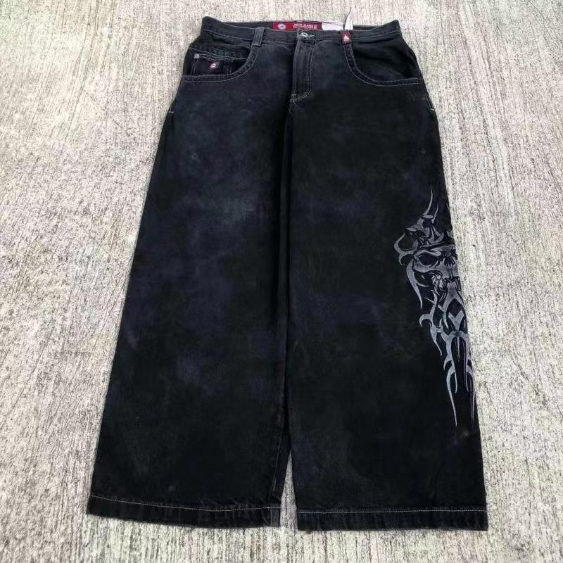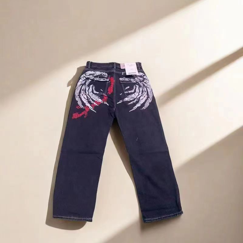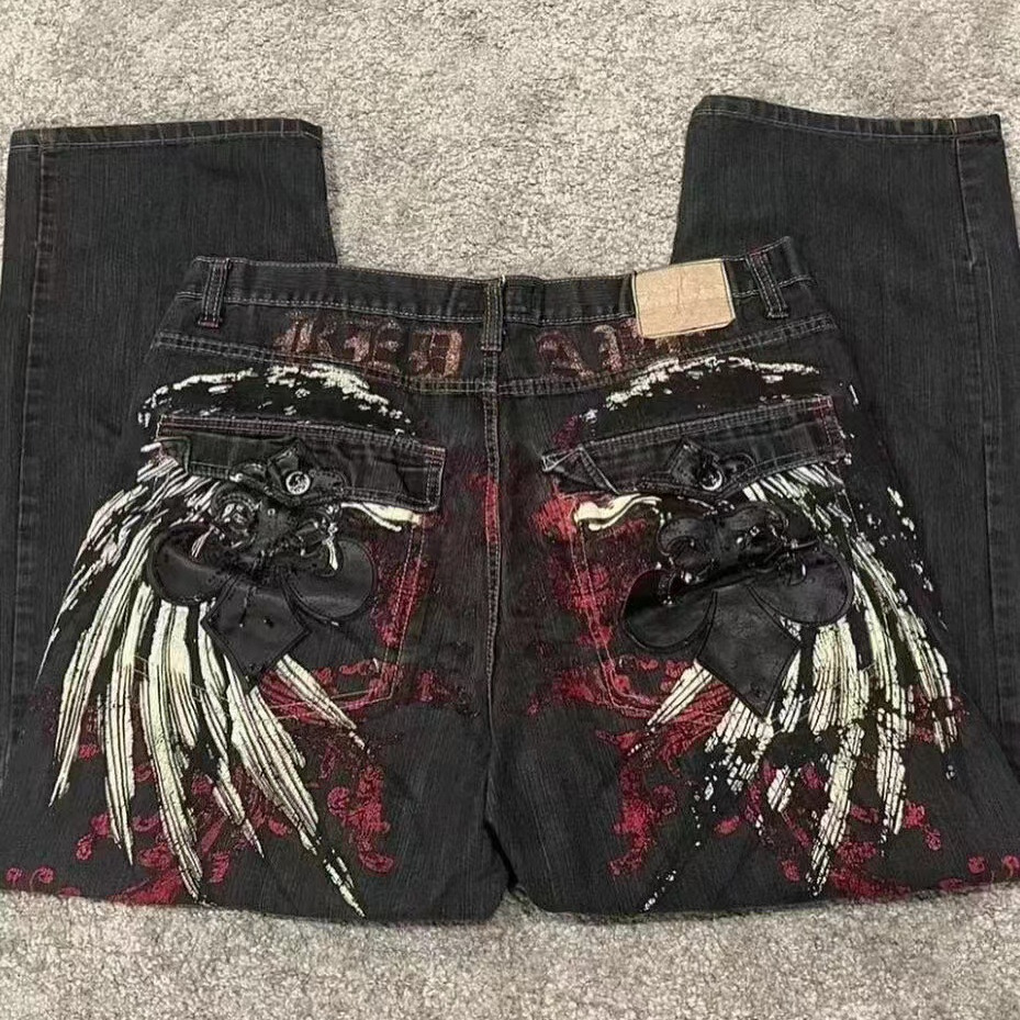 街頭服装ゆるいジーンズY2Kヒップホップポケット翼プリント黒ジーンズ男高腰広脚ズボン