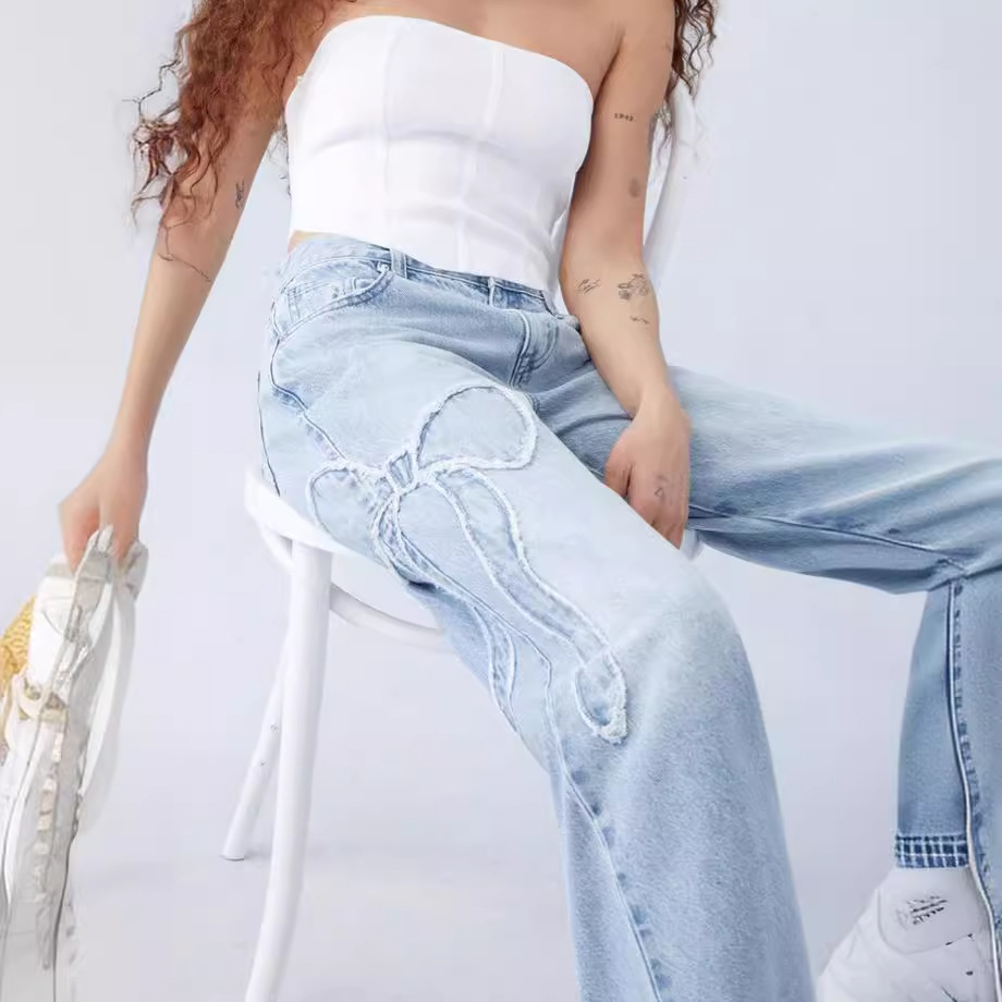 アメリカの高街の蝶結びは布のゆったりしたジーパンを貼ります。