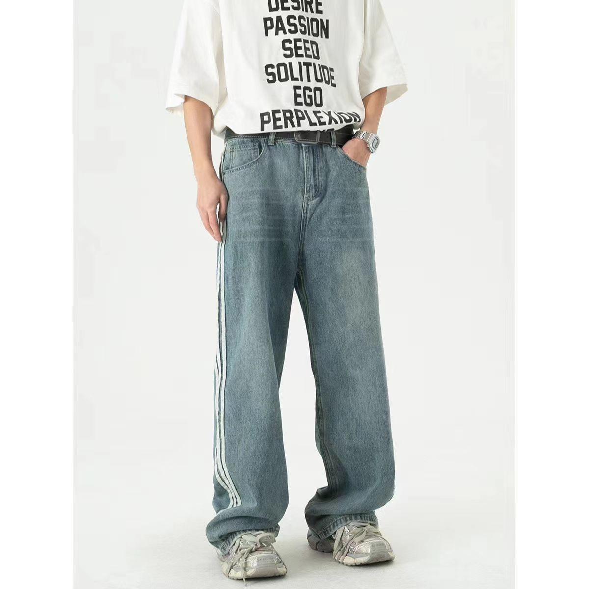 アメリカ式高街国潮レトロ側条ゆるい広脚デニムパンツ男女潮牌ゆるい水洗いジーンズ