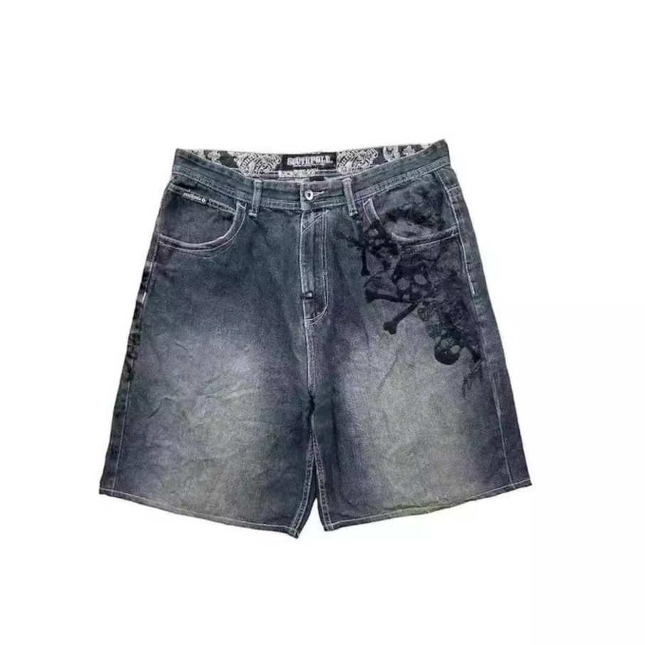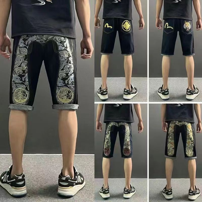 クロスボーダーの夏の新型欧米の流行のアルファベットの全刺繍のデニムの半ズボンの男性の高い街の小さい衆の広い足の5分のズボン