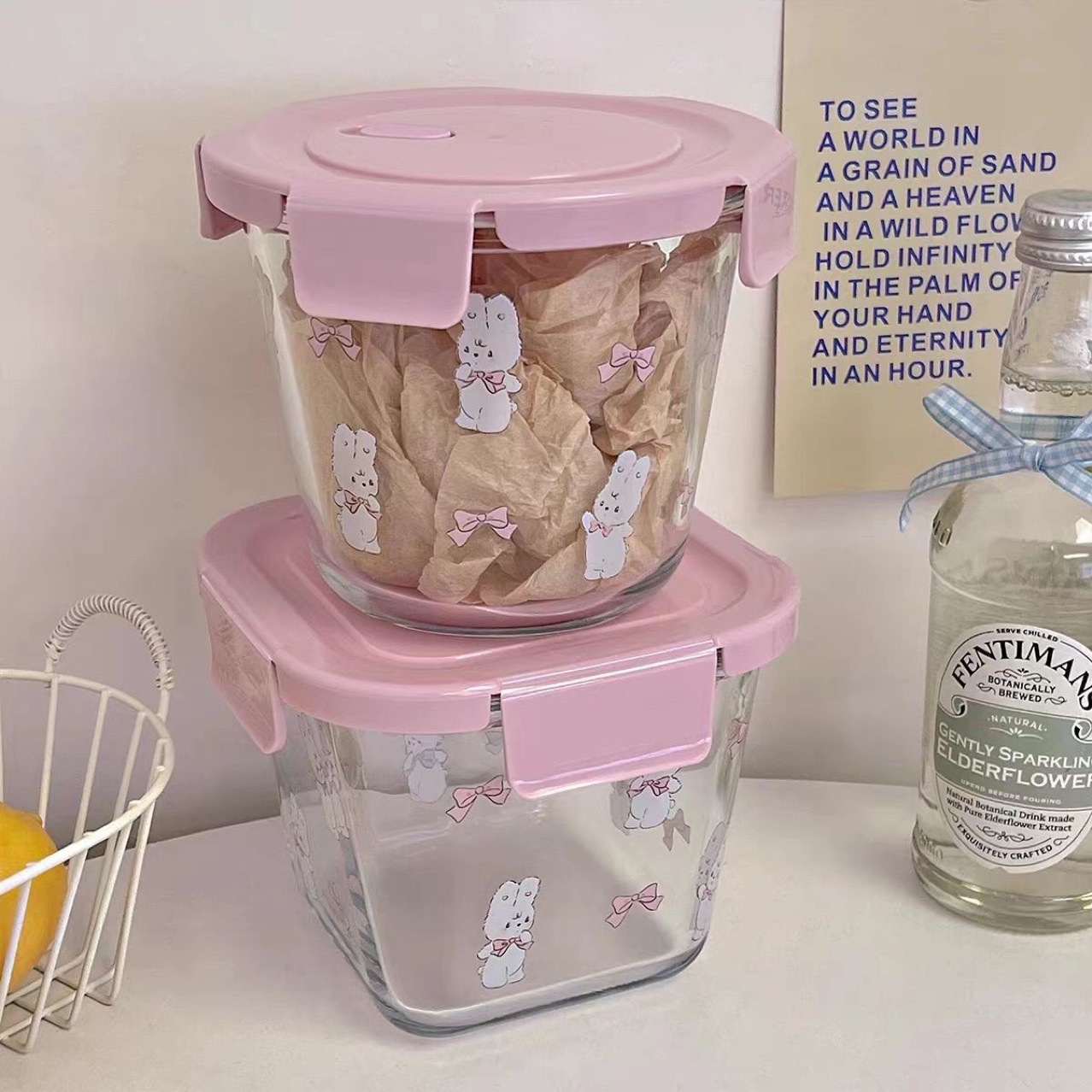 ピンクのウサギのガラスの弁当箱の少女の心は冷蔵できます。