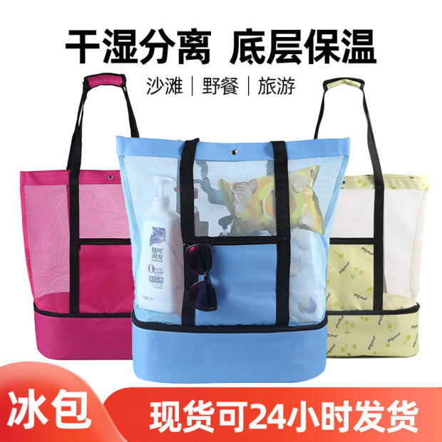 多機能ビーチメッシュバッグ二層屋外ポータブルポータブルショルダー断熱バッグ旅行アイスバッグ収納ビーチバッグ