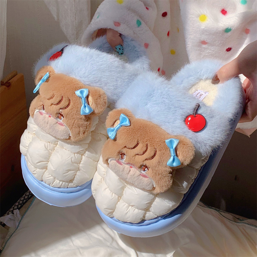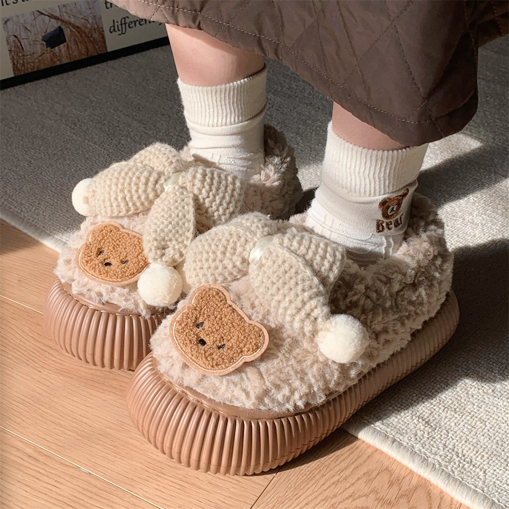 韓国版ins風保温ファッション家庭毛羽立ち靴快適かわいい蝶ネクタイ熊一字綿スリッパ女冬