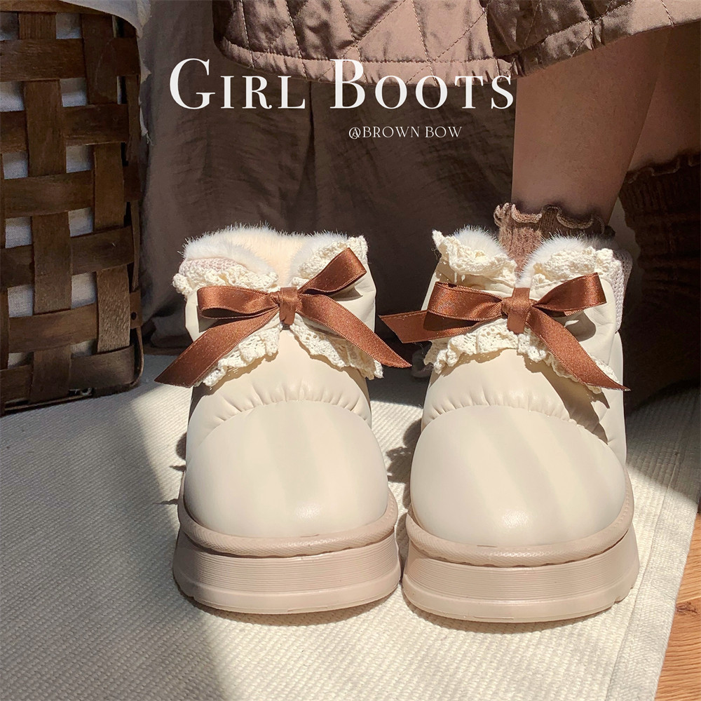 2024冬の新型女性レトロファッション蝶ネクタイ雪地靴厚い底ベルベット保温東北綿靴ブーツ