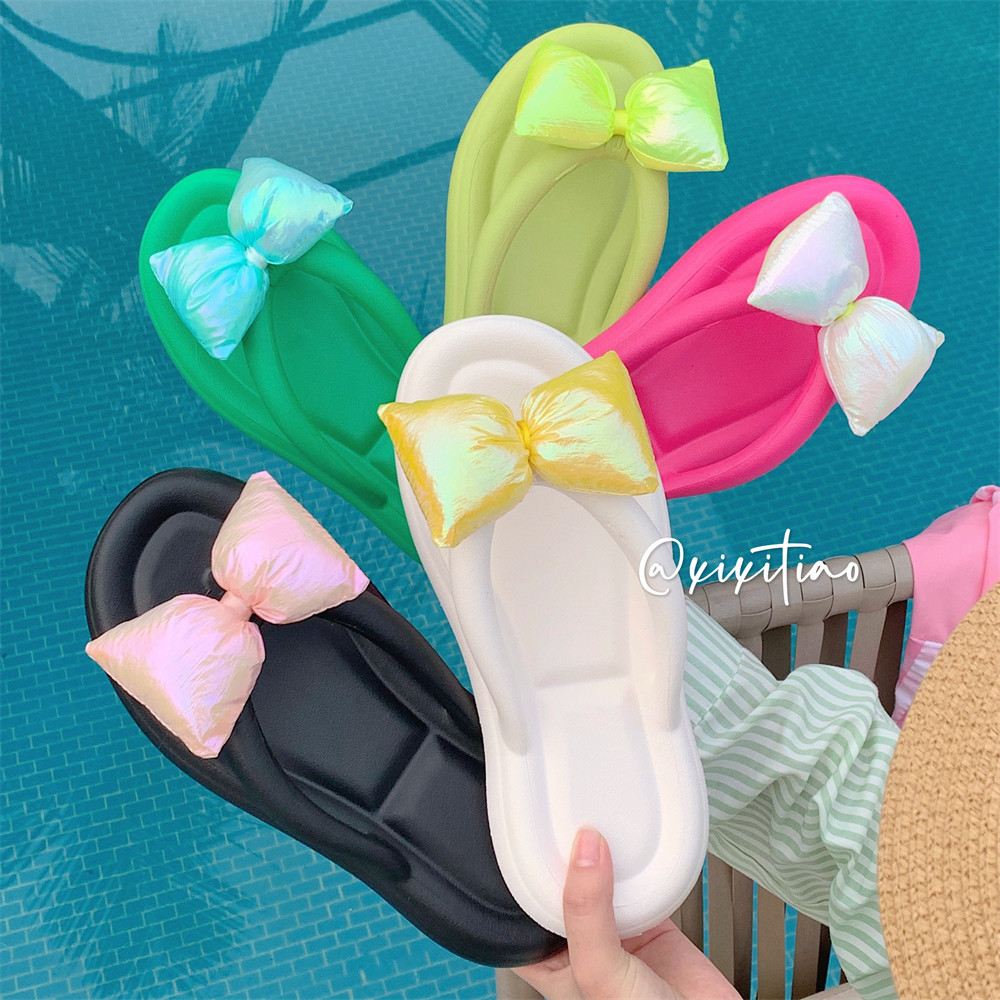 海辺のビーチ夏の女性の休暇スリッパアンドロメダ風のかわいい蝶ネクタイの柔らかい底に足の人の字のスリッパを挟む