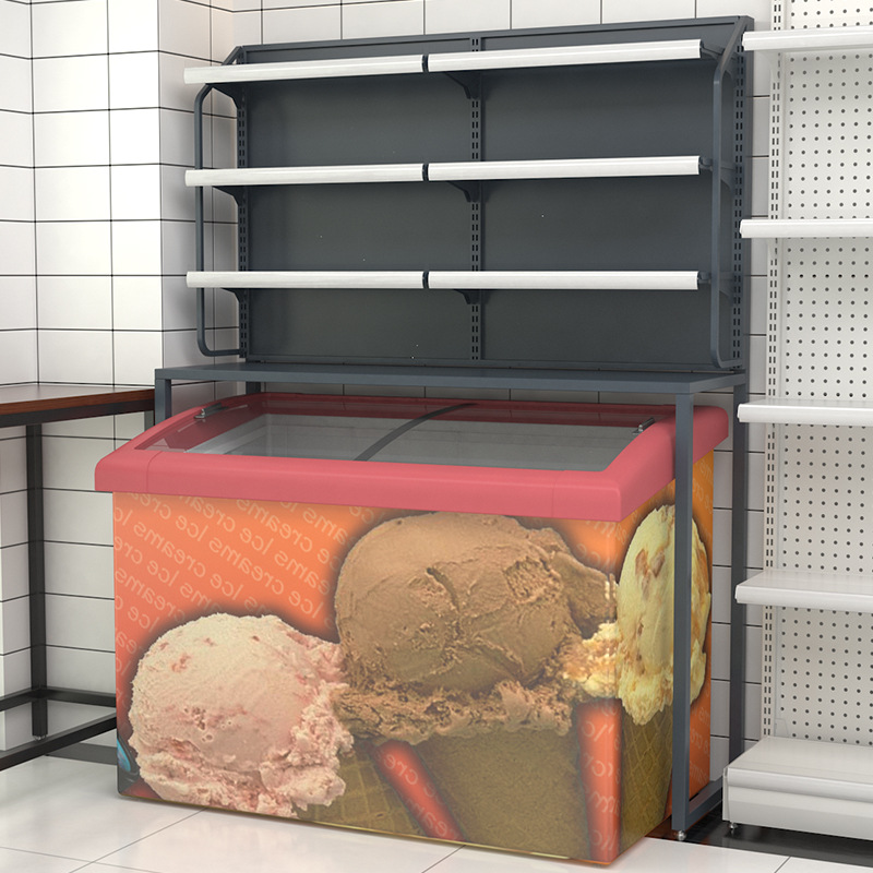 スーパーマーケットの冷蔵庫の上の棚のコンビニのアイスクリームの棚の展示棚の飲み物の棚の売店の冷凍庫の棚