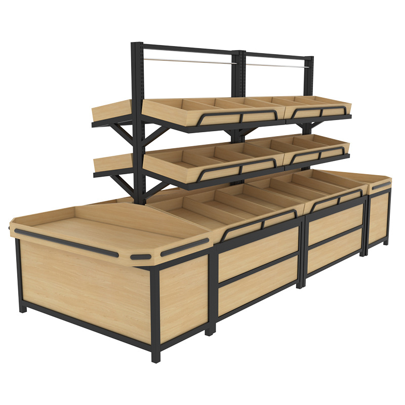 果物と野菜の果物の棚の鋼鉄の木の貨物棚の生鮮のスーパーのお金のおばさんの展示棚の間食の乾燥している果物の果物の棚