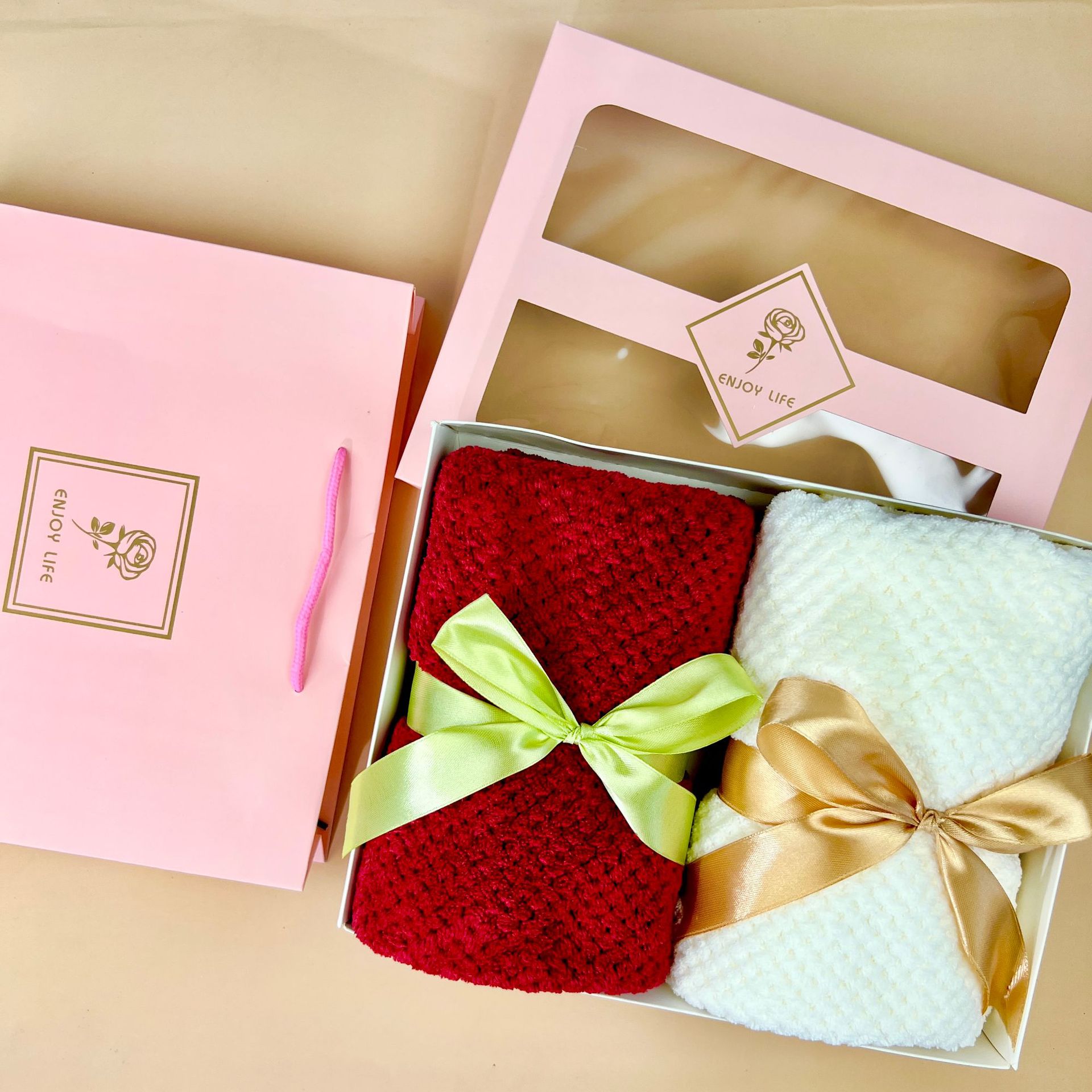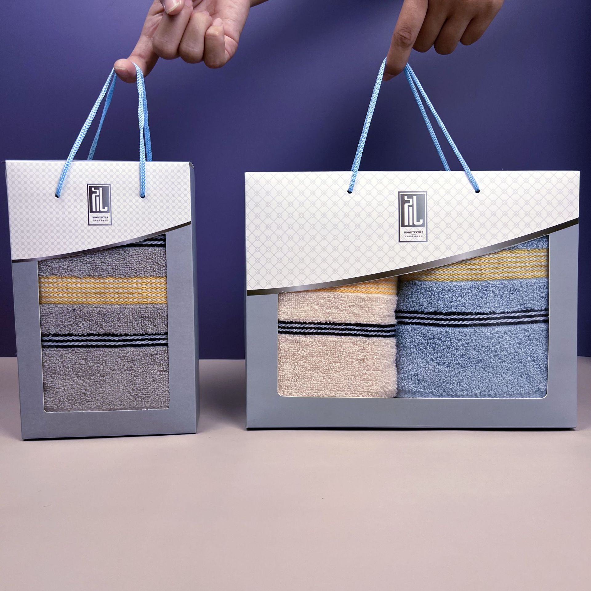 2枚のタオルを手にしたギフトボックスは、携帯会社のビジネススタッフがお返ししたプレゼントを持って共同購入した
