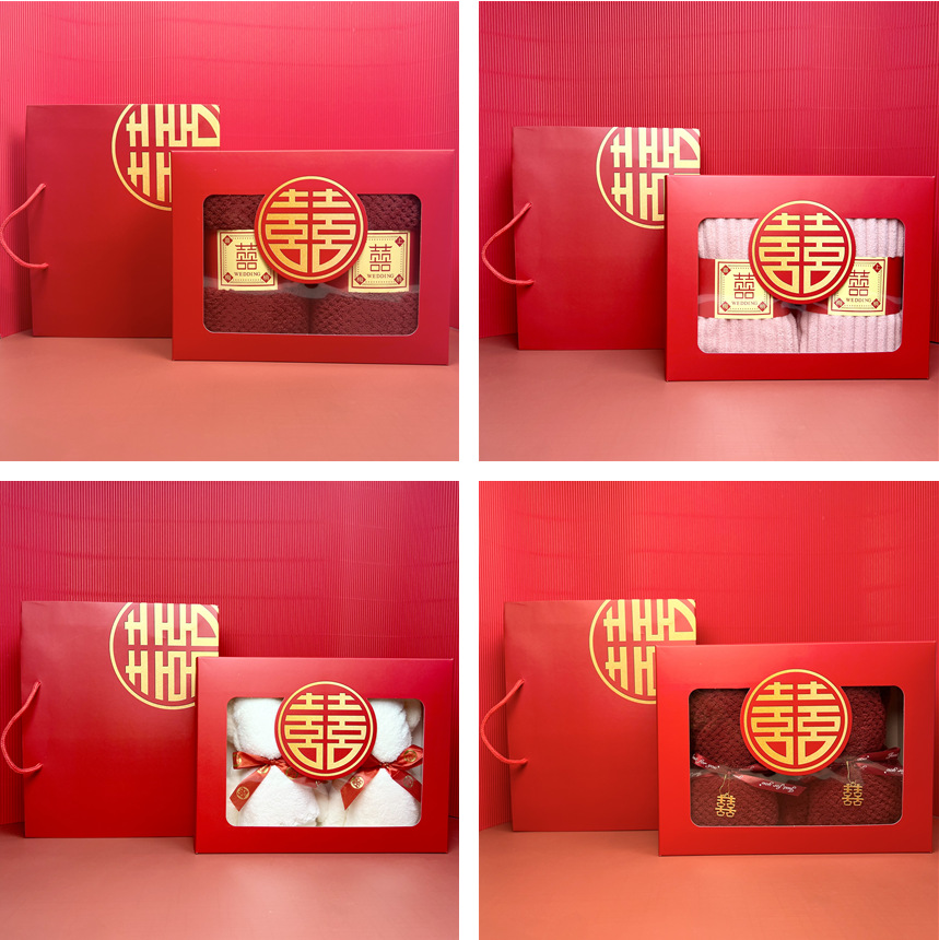 赤い結婚タオルのギフトボックスのセットサンゴの毛の熊の喜字のギフトボックスのタオルの手の贈り物は結婚祝いのお返しを予約します。