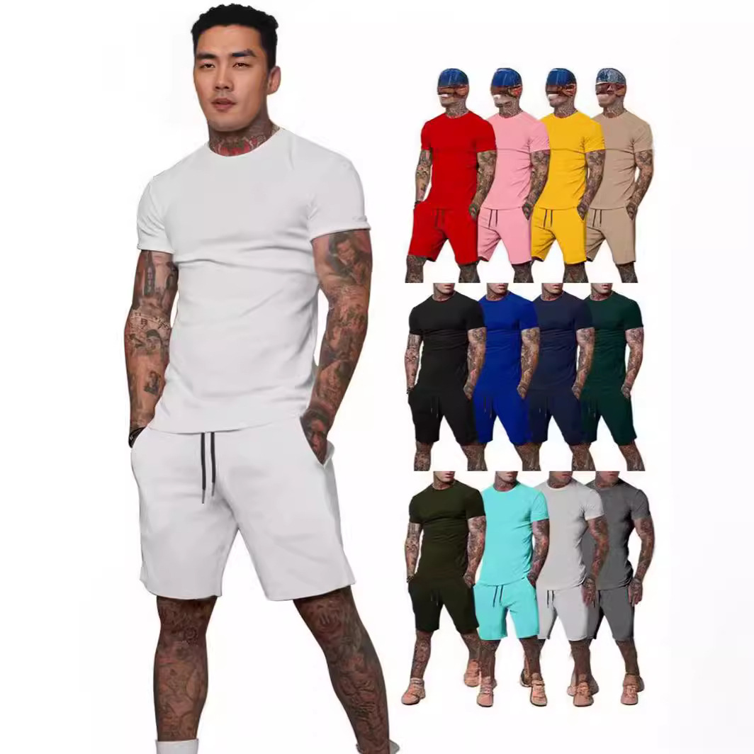2024国境を越えた男性の新型純色半袖パンツスポーツスーツ夏スポット2点セットはロゴを印刷できる