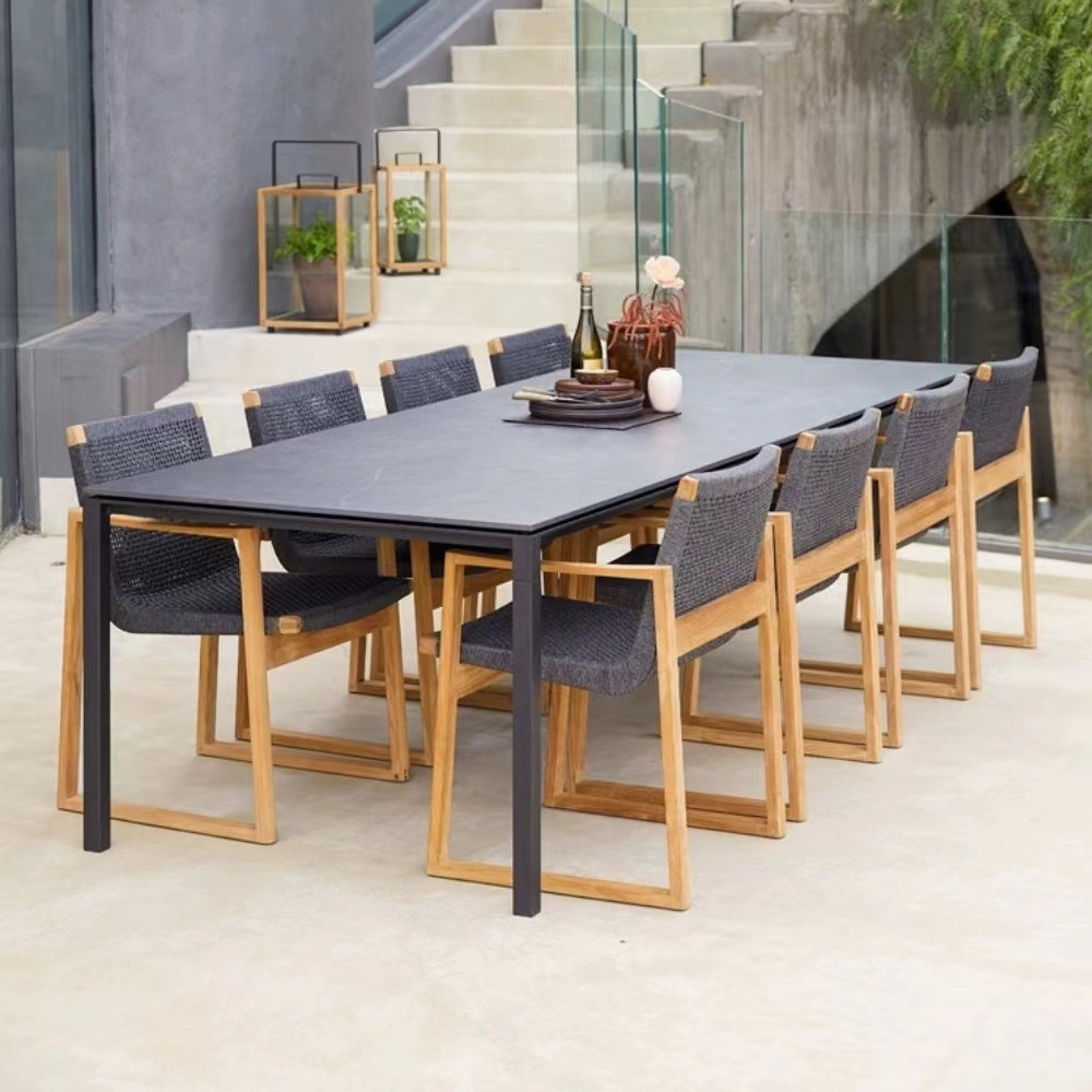 北欧屋外チーク木テーブルと椅子の組み合わせ庭園露天バルコニー藤編テーブルと椅子屋外防水日焼け止め家具藤椅子