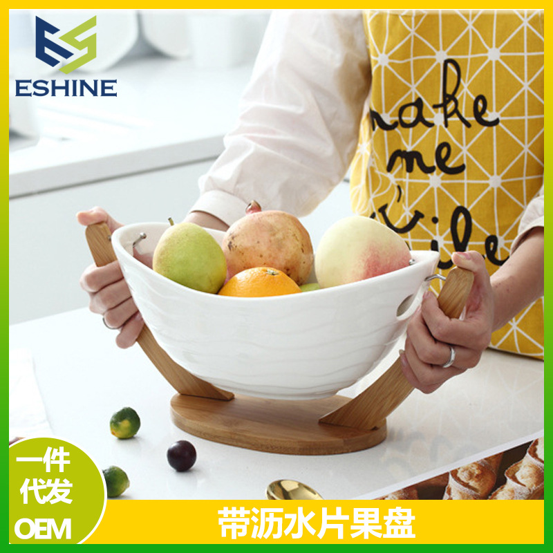軽くて豪華な金辺陶磁器の果物かごの果物の皿の家庭用の客間のアイデアの元宝の果物の皿の竹の木のセットは水切りの切れを持っています。