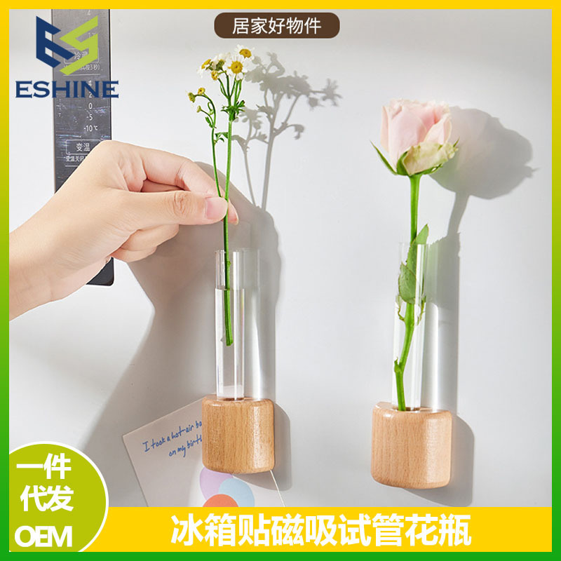 原木色の冷蔵庫に試験管を貼って花瓶を挿します。