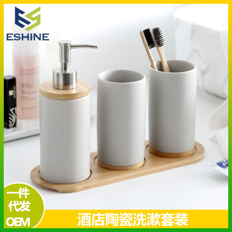 うがいコップ四点セットセラミックコップ手洗い液押え瓶石鹸箱トレーホテル民宿洗面セット