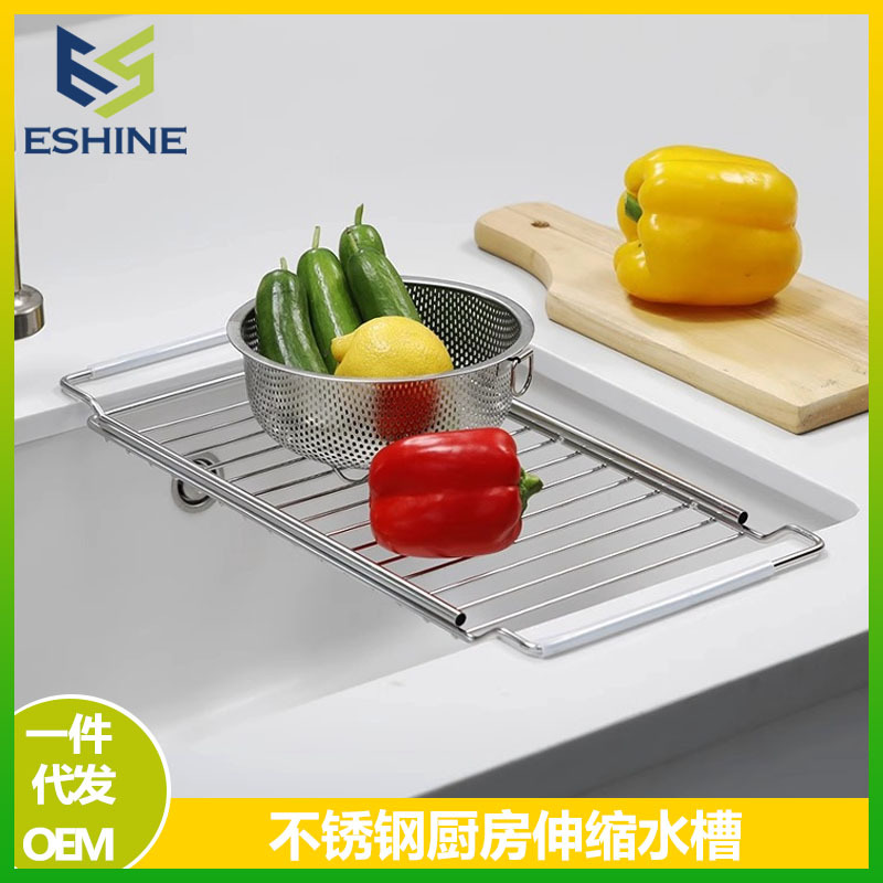 ステンレス製の水切りラックは伸縮可能です。キッチン収納棚水槽で果物を洗います。