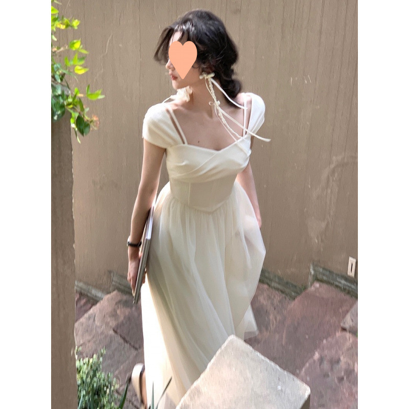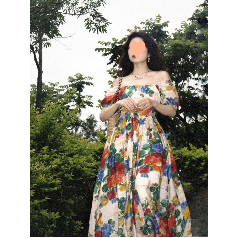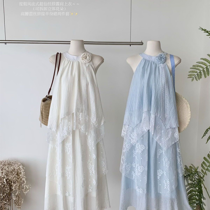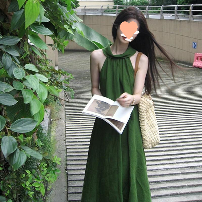 2025 夏フレンチホルターネック気質ウエストリラックススタイルホリデードレスフォレストスタイル美白オフショルダーロングスカート