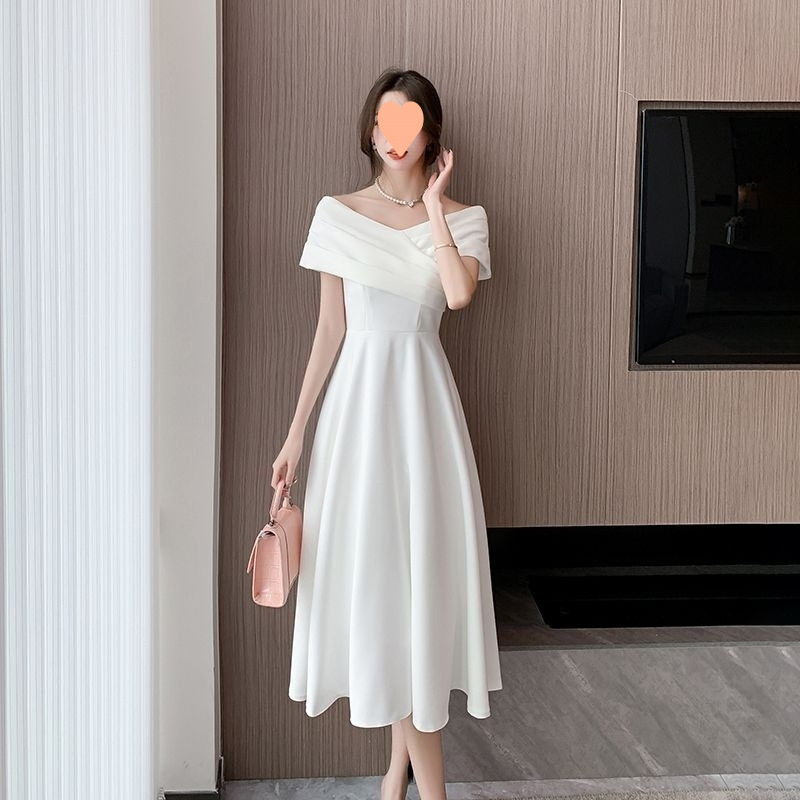 ワンショルダーイブニングドレスハイエンドライトラグジュアリーニッチフレンチエンゲージメントドレスホワイト登録証明書ホワイトスカート夏