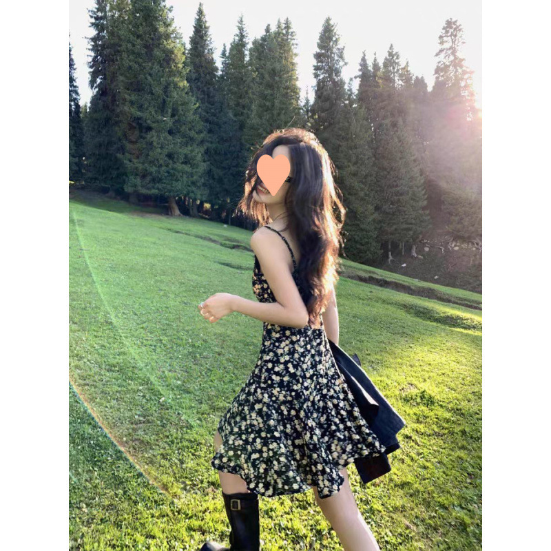 フレンチVネックブラック花柄サスペンダードレス2025春夏小柄ウエスト痩身Aラインスカートボトリングスカート