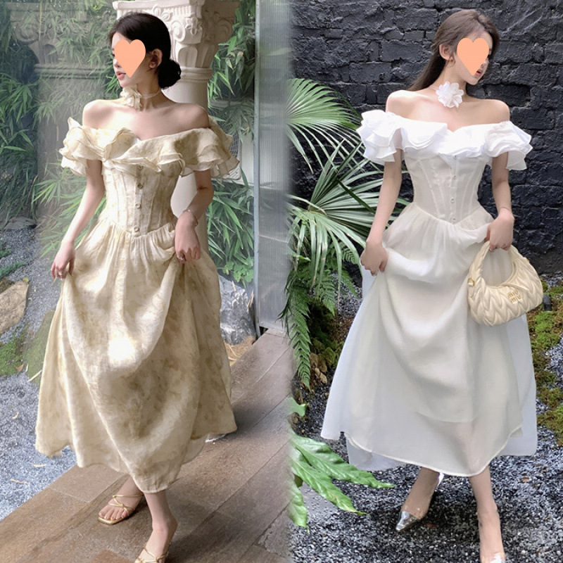 レトロなハイエンドの妖精ワンラインカラードレス女性のための 2025 夏の新しいスタイルの優しいスタイルのウエストオフショルダーロングスカート