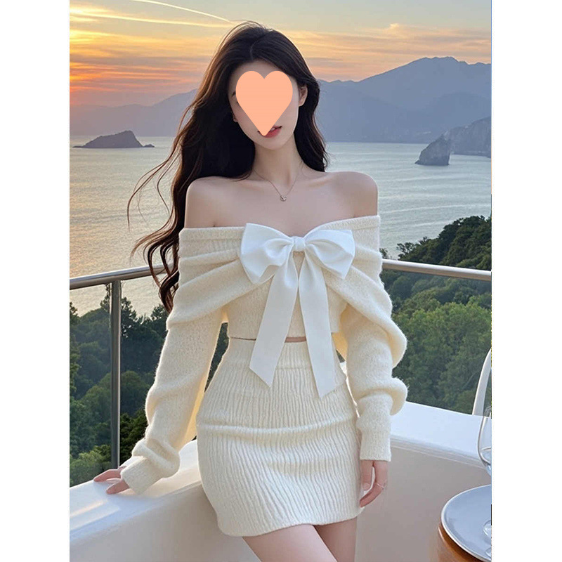 秋冬のピュアラストスタイルホワイトデザインワンラインカラーリボントップハイウエストスカート気質ツーピーススーツ女性用