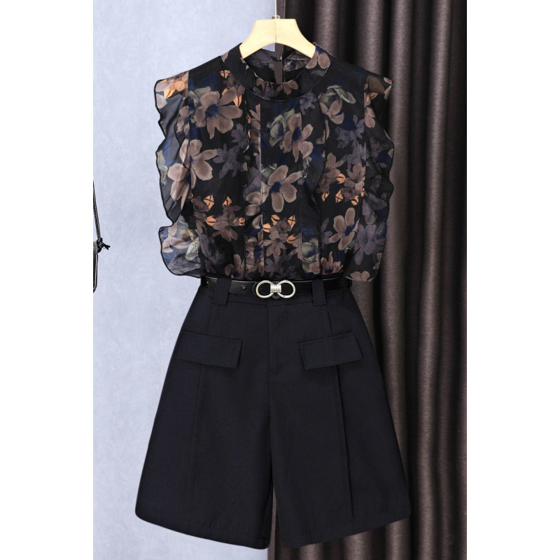 花柄トップス 2 点セット 2025 新しい夏の女性の服、女性のスタイリッシュで年齢を軽減するためのスーツの完全なセット