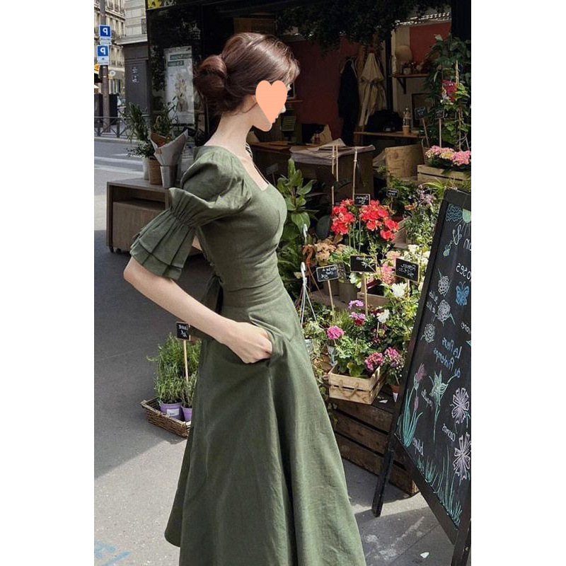 フレンチレトロヘボンスタイルのハイエンドスクエアネックパフスリーブドレス女性の夏の新しいドレープウエストロングスカート
