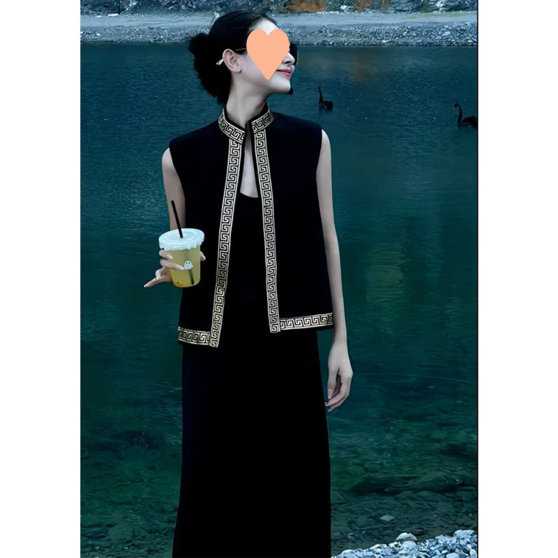 美しくユニークな新しい中国風の禅スタイルスーツスカートコールドスタイルハイエンドブラックベストドレス2点セット