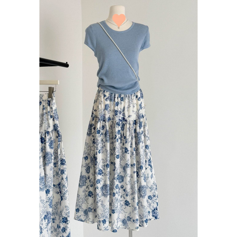 サマースーツレトロ水墨画花柄スカートレディース夏ハイウエストデザインフレンチロングスカート2点セット