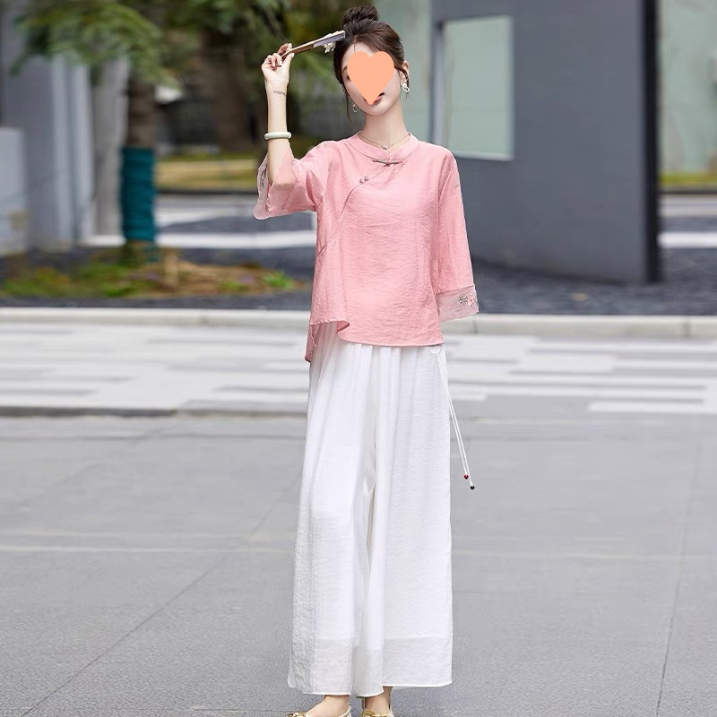 中国風のファッション綿とリネンのスーツ女性のための 2025 夏の新しい大きいサイズのルーズワイドレッグパンツ新しい中国風の 2 点セット