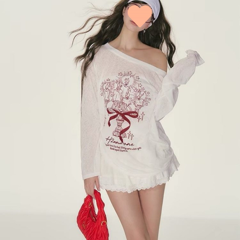 2025 新しい落書き斜め肩 Tシャツ日焼け止めブラウス女性の春と夏の薄いルーズトップレーススカート 2 点セット