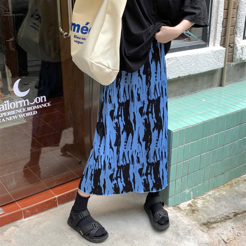 夏用氷冷ドレープインクスプラッシュタイダイミディスカートレディース大きいサイズ痩身プリントスリットAラインロングスカート