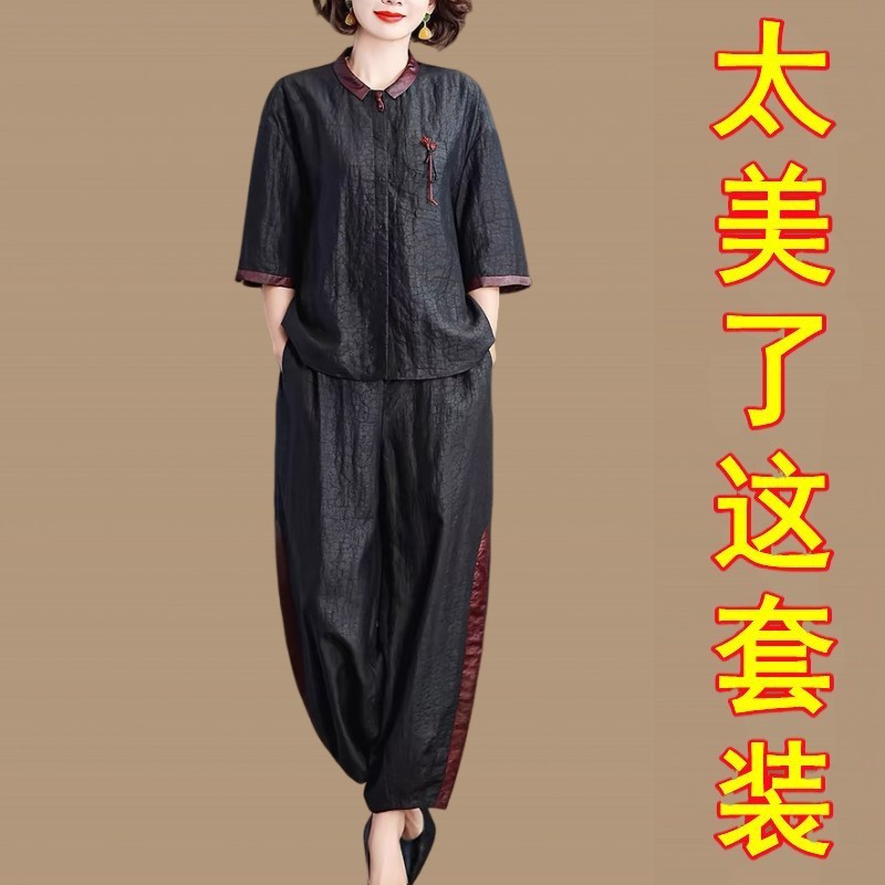 新しい中国風の香りの雲ガーゼトップハイエンドママスーツ女性の夏の新しいレトロな中国風のシルクハーレムパンツ 2 点セット