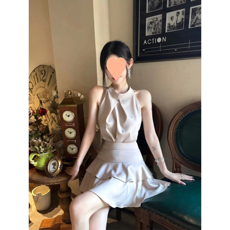 おしゃれな洋風スーツ、オフショルダーホルターネックおしゃれベスト+ハイウエストフリルパフスカートツーピースサマースーツ