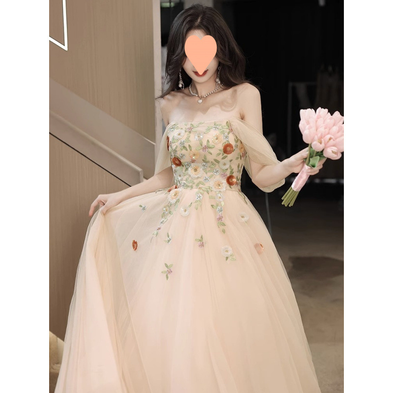 新しいフレンチワンショルダーシャンパンカラードレスハイエンドライトラグジュアリーニッチフェアリーホスト卒業芸術試験ロングスタイル