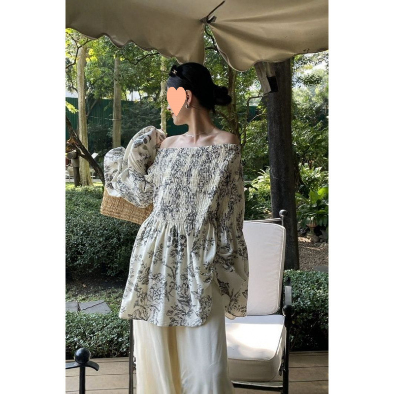 2025 春夏オフショルダーワンラインカラー長袖万能シャツ女性の春のお出かけ雰囲気フレアスリーブトップス