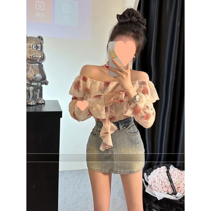 夏の新しい韓国スタイルのホットガールワンショルダー花柄シフォントップ + ハイウエストスリムデニムスカートスーツ女性用