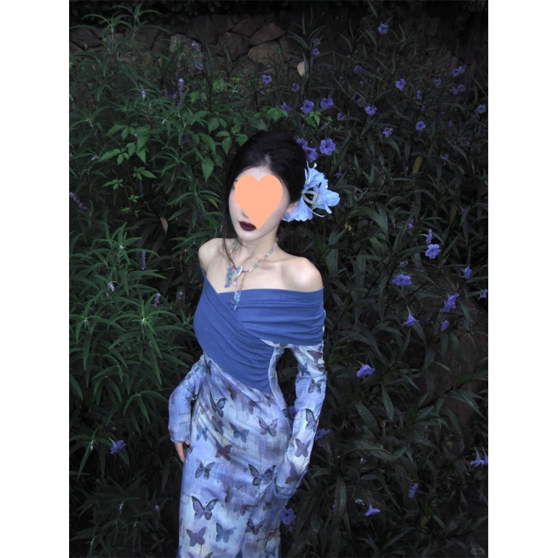 フレンチレトロクールバタフライプリントスプライシングワンショルダードレス女性の秋のウエスト痩身フィッシュテールロングスカート