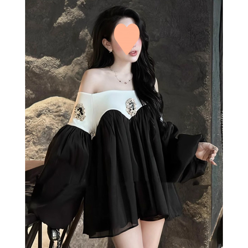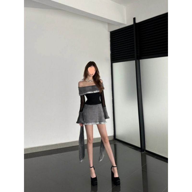セクシーなワンショルダー長袖ドレス女性のための冬の新しい純粋な欲望ホットガールスタイルスリムコントラストカラーステッチリボンスカート