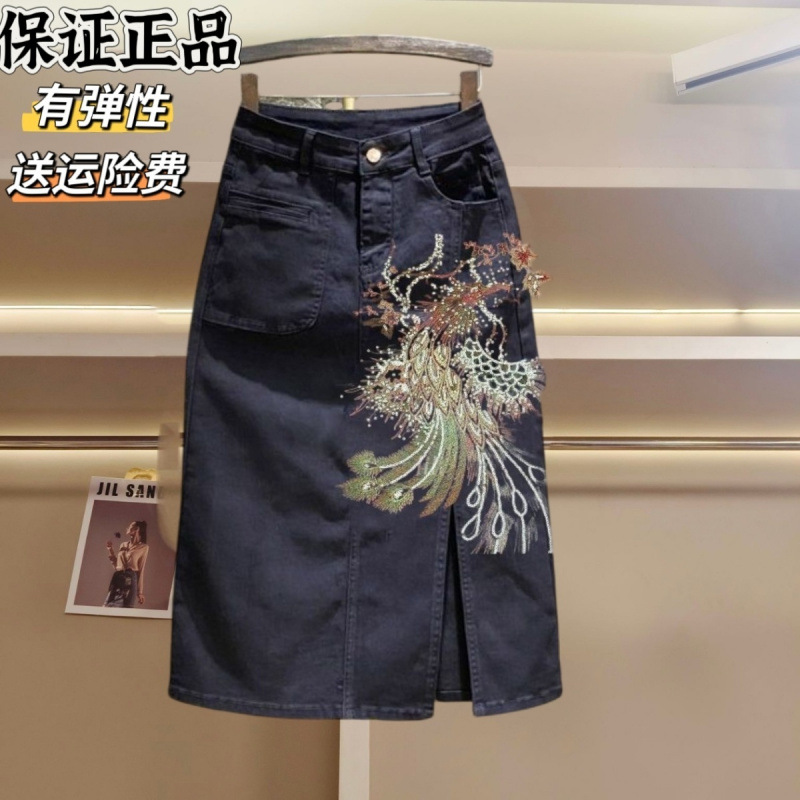 2025年夏新作中国風ブラックフェニックスデニムスカートハイウエスト伸縮性スリムフィットミドル丈スカート