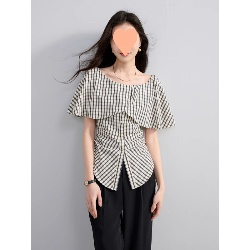 2025 夏の新デザインフリルワンラインカラーチェック柄シャツスリットウエストトップ女性用
