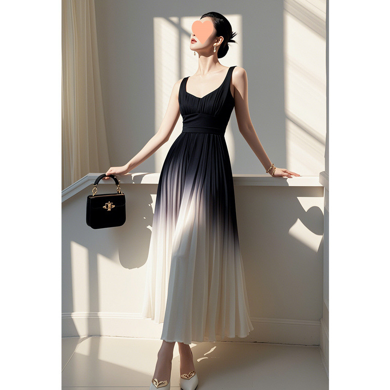 フレンチニッチデザインの白黒グラデーションサスペンダードレス、軽い高級感とセレブ気質、美しいワンショルダーロングスカート