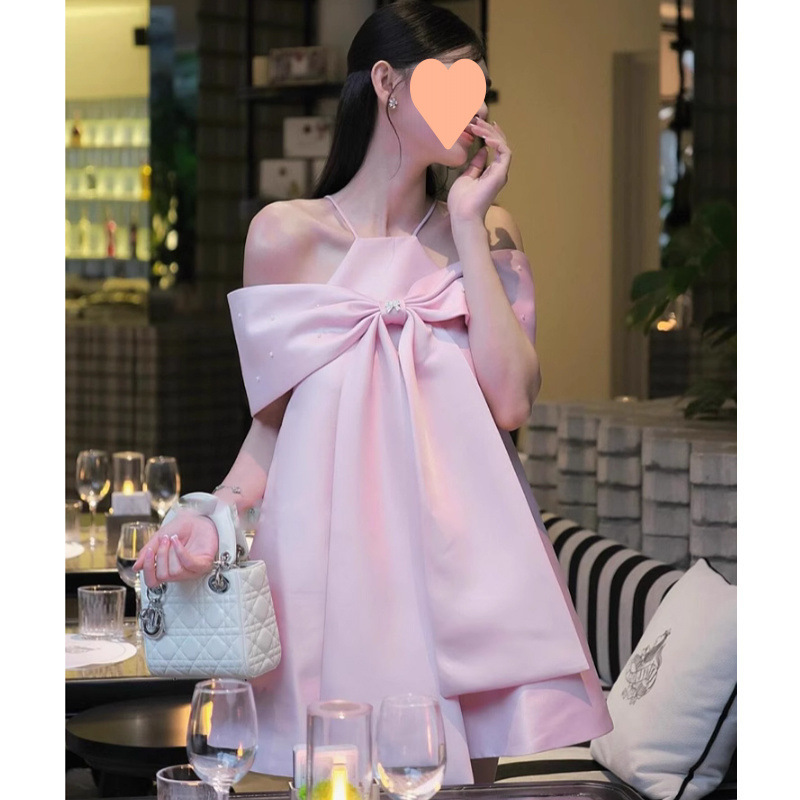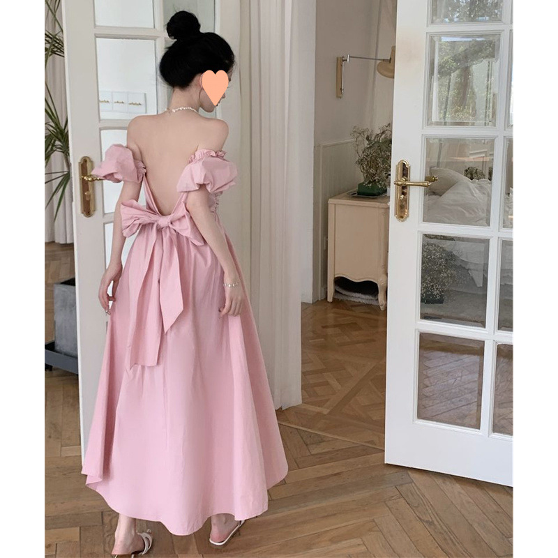 優しいピンクのパフスリーブワンショルダードレス女性の夏の新しいスタイルのリボンバックレススリムロングスカート
