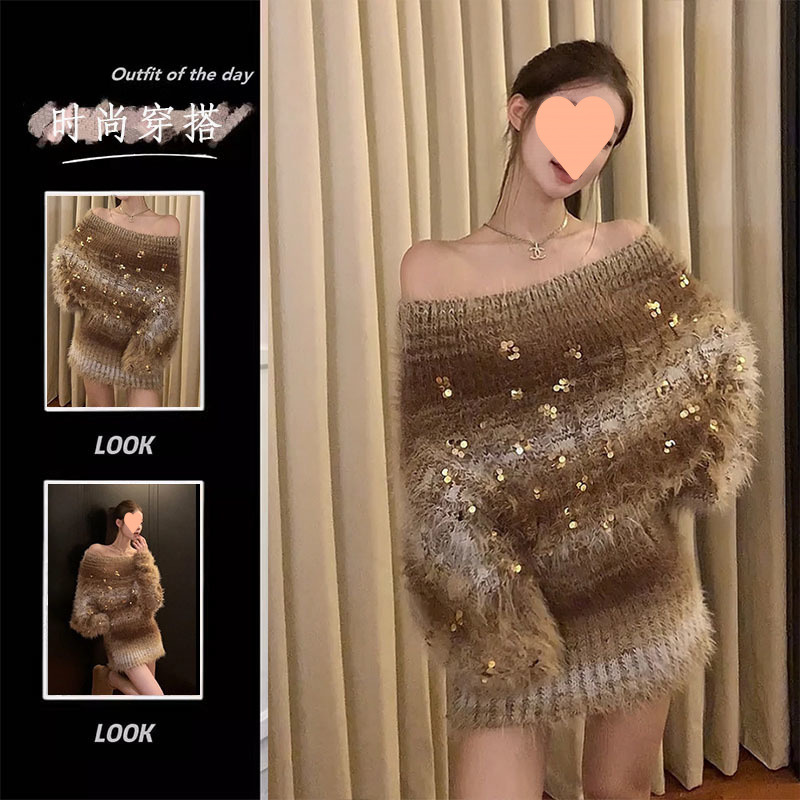 ファットmmレトロメイラードスパンコールセーターレディース秋冬純粋な欲望プラスサイズワンショルダーセータードレス